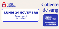 Une collecte de sang se tiendra au Centre sportif de Boischatel (160, rue des Grès) entre 14 h et 20 h le lundi 24 novembre prochain, SUR RENDEZ-VOUS SEULEMENT. Pour réserver votre passage, communiquez avec Héma-Québec au 1 800 343 7264 ou à jedonne@hema-quebec.qc.ca ou encore, prenez rendez-vous en ligne.